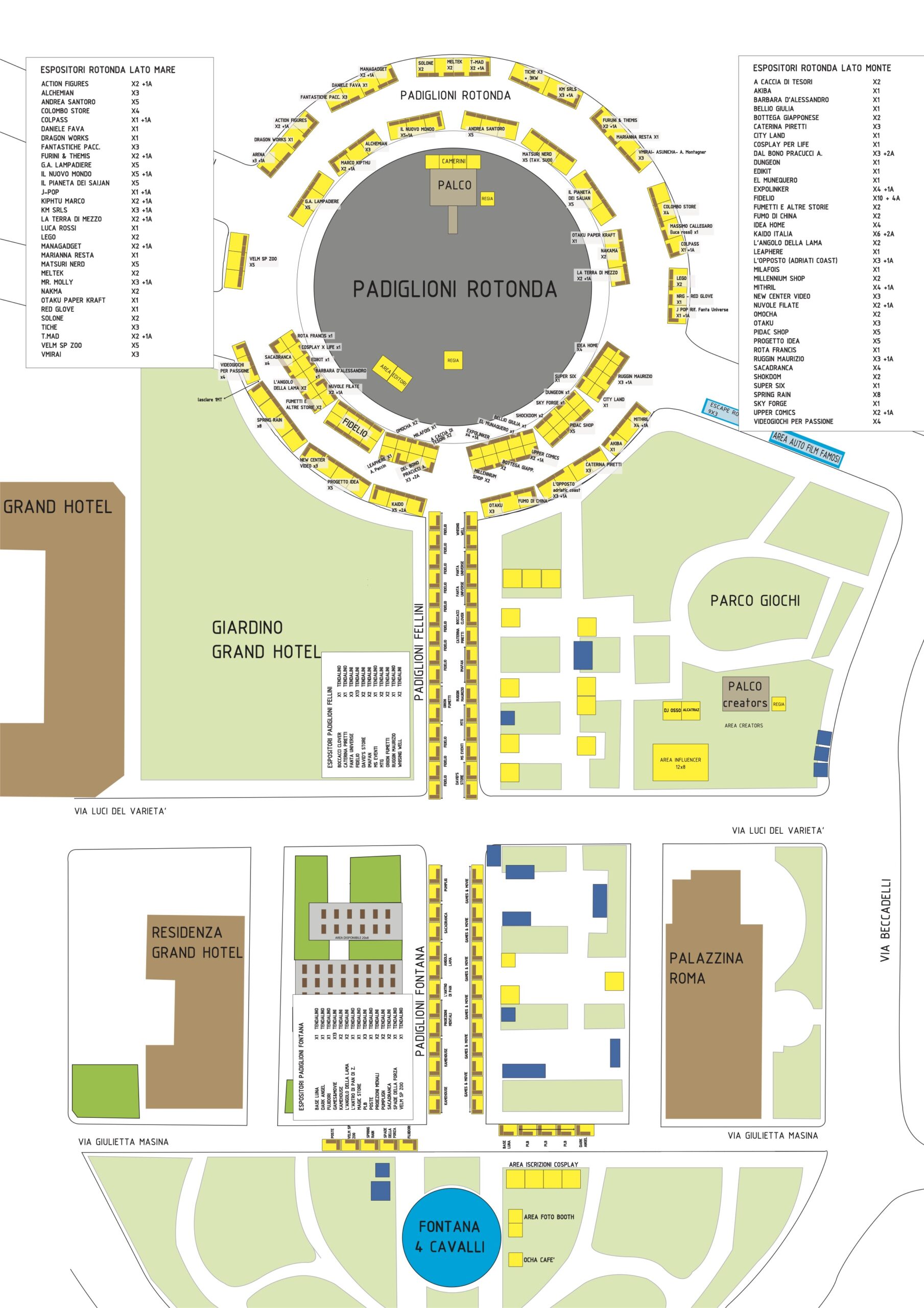 Above you can see the General Map of Rimini comix 2023. at the bottom you can see the Fountain of the 4 horses and at the top you can see the Rotunda in Piazzale Fellini.