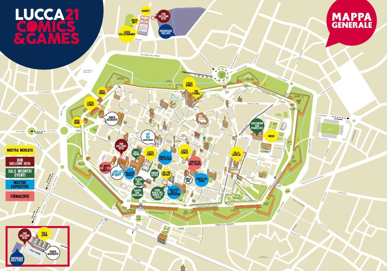 Il festival del fumetto di Lucca Comics Quest'anno si svolgerà nei vari palazzi storici della città, avrà come gli anni passati un'estensione completa all'interno delle mura cittadine con alcune aree tematiche esterne, non verranno allestiti i caratteristici tendoni (almeno non tutti) come le edizioni passate. La Mappa del lucca comics and Games 2021 è divisa in cinque categorie di zone, le zone gialle saranno quelle dedicate alla mostra mercato dove potrete trovare gli oltre 100 espositori ed aziende che presenteranno e venderanno i propri servizi e prodotti direttamente in loco la maggior parte delle zone espositive sarà dislocata all'interno dei palazzi storici ad eccezione di un paio di tensiostrutture dedicate al Lucca Comics dove si potranno trovare editori, case editrici e rivendita di fumetti e comics.