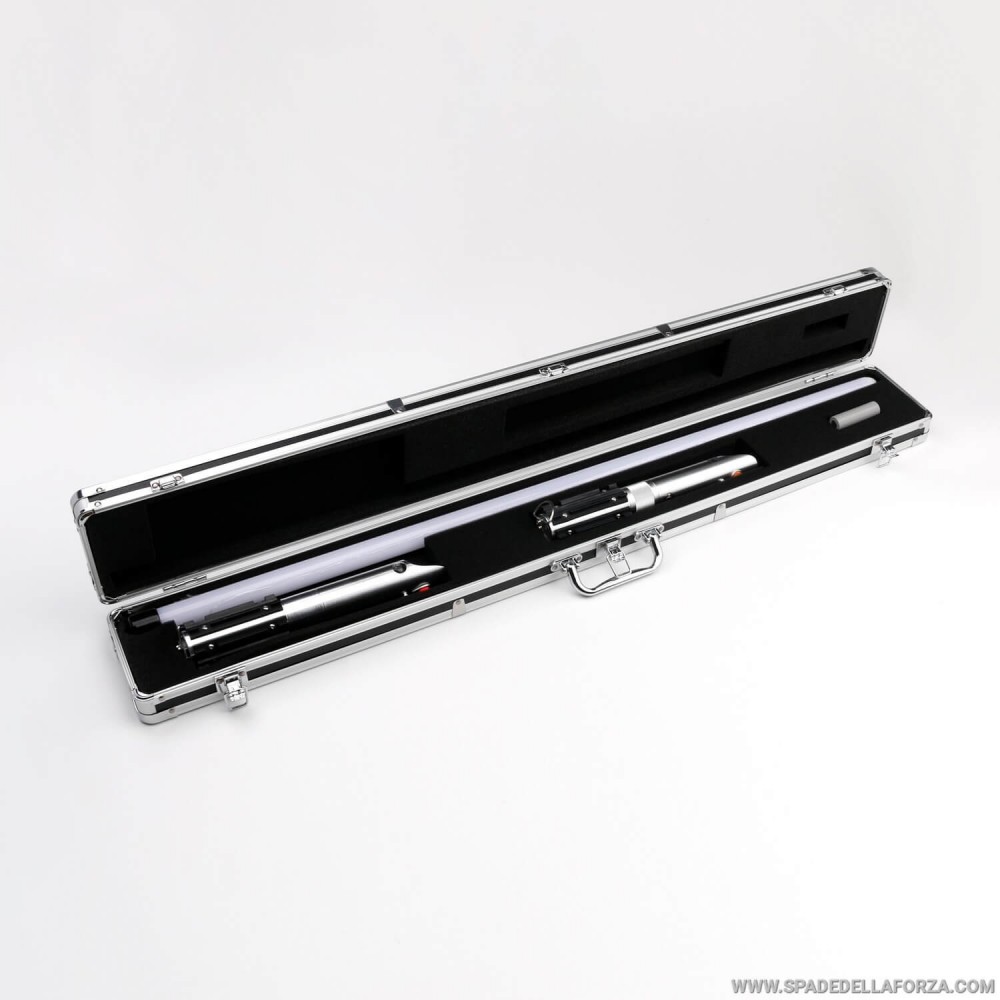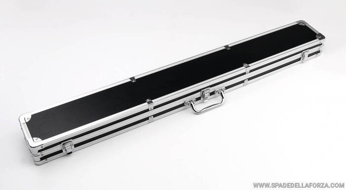 valigia realizzata in metallo e plastica per il trasporto e lo stivaggio di due spade laser.