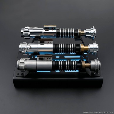 Supporto espositore per spade laser realizzato in metallo con una capacità fino a 3 impugnature. Il supporto è provvisto di una base illuminata che può essere comandata tramite il pulsante dedicato per avere vari colori di luci e alcuni effetti luminosi differenti per un grande impatto visivo.